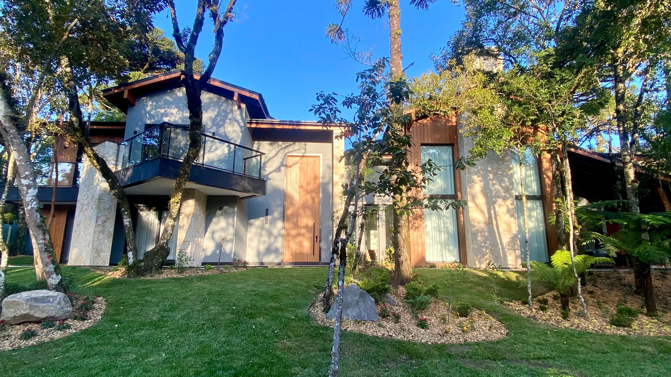 Ao entrar, você é recebido por um imponente pé-direito duplo com forro de madeira aparente e amplas janelas panorâmicas, que garantem luminosidade natural e visual da natureza. O projeto valoriza aconchego, amplitude e funcionalidade. com equilíbrio entre o rústico e o moderno e uma volumetria de telhados que imprime personalidade única à fachada.